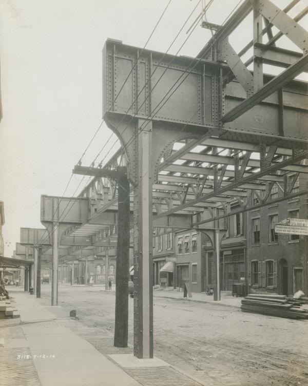 View looking north at recently constructed steel bents and through trusses on Front Street, near Girard Avenue. Includes signboard for Gustav Berger's sash door business.