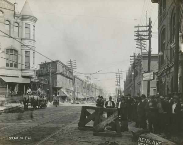 View looking north from a marker for bent 244 on Kensington Avenue. The east sidewalk is crowded with spectators. A man sits in a large cart hitched to a team of horses on the west side of the block. A trolley travels down the tracks in the distance. The elevated railway bridge spanning the Philadelphia and Reading Railroad tracks near Lehigh Avenue is also visible. Businesses include Edward C. Johnson's liquor store (2473 Kensington Avenue) and Munch's Saloon (2500 Kensington Avenue).