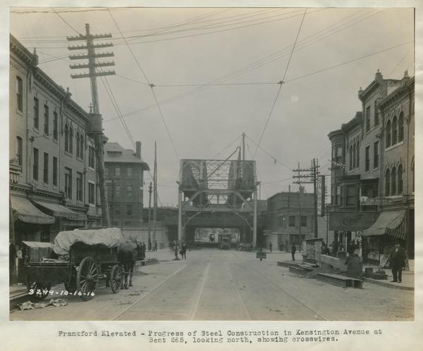 View looking north along Kensington Avenue at the construction of a truss bridge that will carry the new elevated railway over the Philadelphia and Reading Railroad tracks near Lehigh Avenue. A horse-drawn delivery wagon sits on the west side of the road. Businesses include a "money back store"; a shoe store; a saloon; Hamilton clothing store; S. Weinstein, tailor; and Chas. Schmelz, tobacconist. Includes a partial view of the Young Men's Christian association, Port Richmond division up on the hill near the railroad tracks.