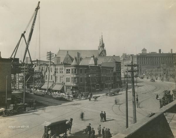 View from the Philadelphia and Reading Railway Company tracks running parallel to Lehigh Avenue, showing the construction of a steel bent on the 2600 block of Kensington Avenue. A crane rises high above the street. Image includes partial views of St. Cecilia's Roman Catholic Church, the five-story brick building of a carpet manufactury, and a row of residences, all on Lehigh Avenue. Spectators stand in the street and on the sidewalks.