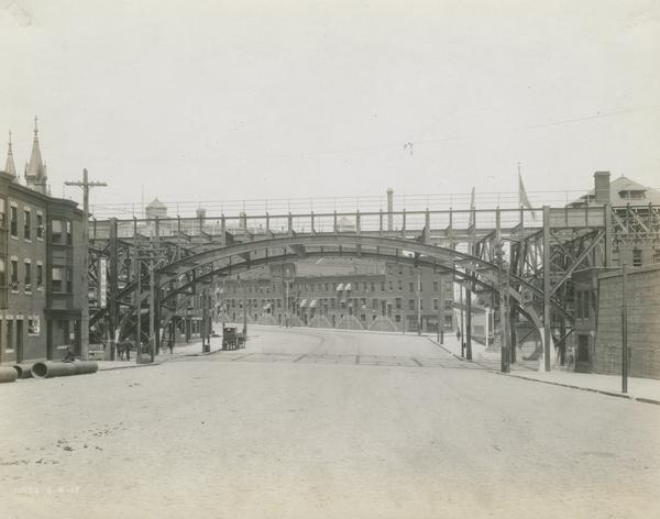 View looking west on Lehigh Avenue, showing the arch of the bridge spanning Lehigh Avenue and the Philadelphia and Reading Railroad bridge.