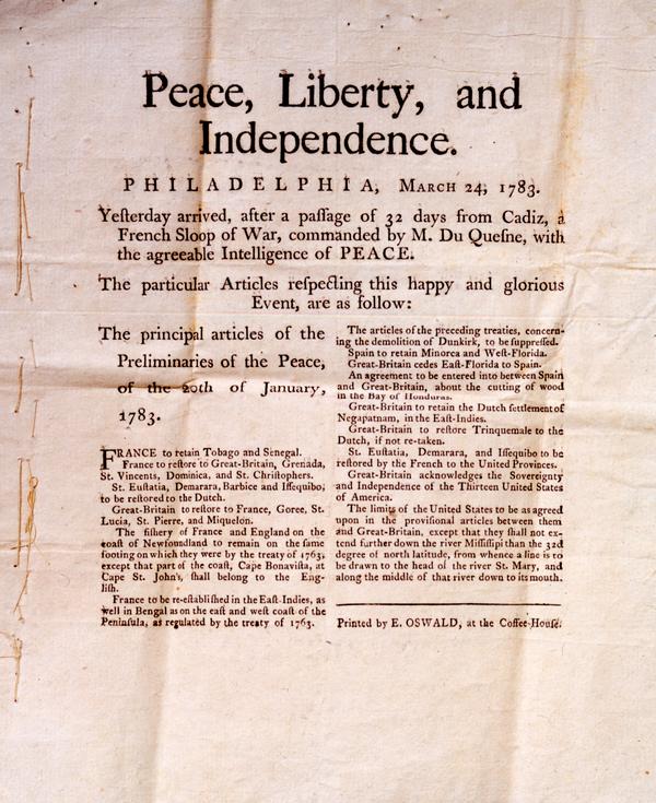 Only known copy of the first announcement of the preliminary peace agreement ending the Revolutionary War. Anonymous gift, 1992.