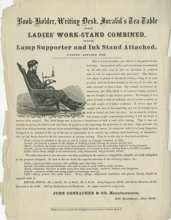 Book-holder, writing desk, invalid's tea table and ladies' work-stand combined, with lamp supporter and ink stand attached.