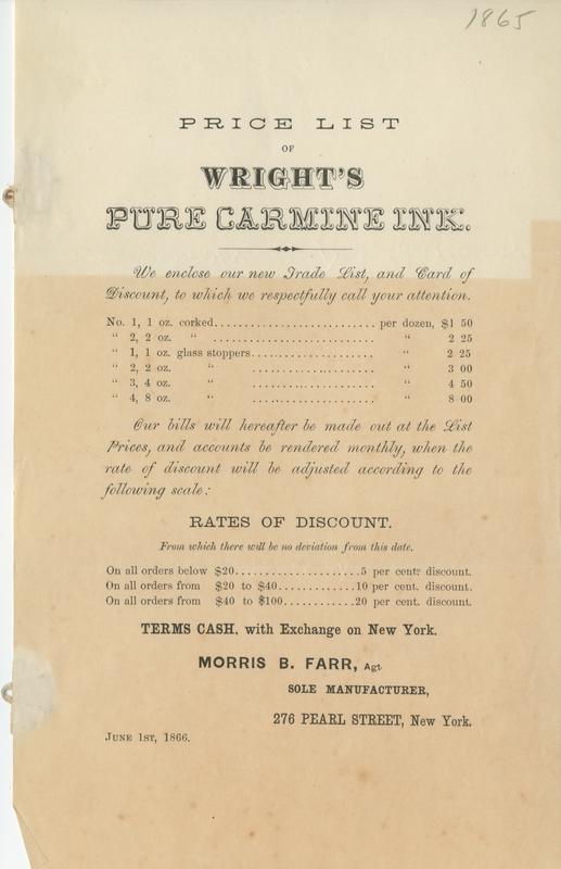 Price list of Wright's pure carmine ink.
