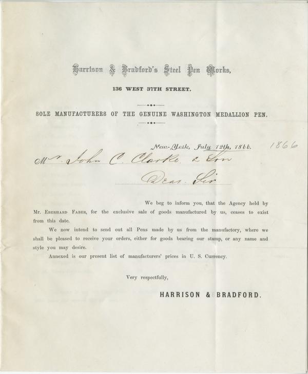 Advertisements in the collection were sent by various manufacturers to John C. Clark & Sons, a Philadelphia stationery firm.