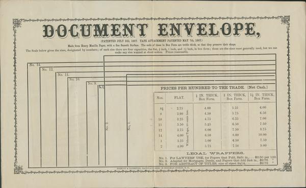 Document envelope, (patented July 23d, 1867. Tape attachment patented May 7th, 1867.).