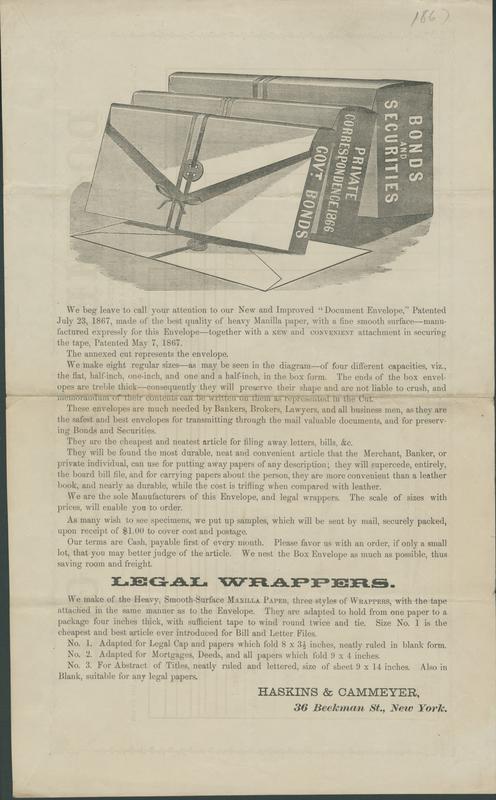 Document envelope, (patented July 23d, 1867. Tape attachment patented May 7th, 1867.).