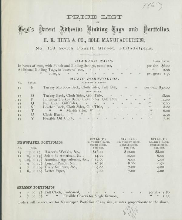 Price list of Heyl's patent adhesive binding tags and portfolios.