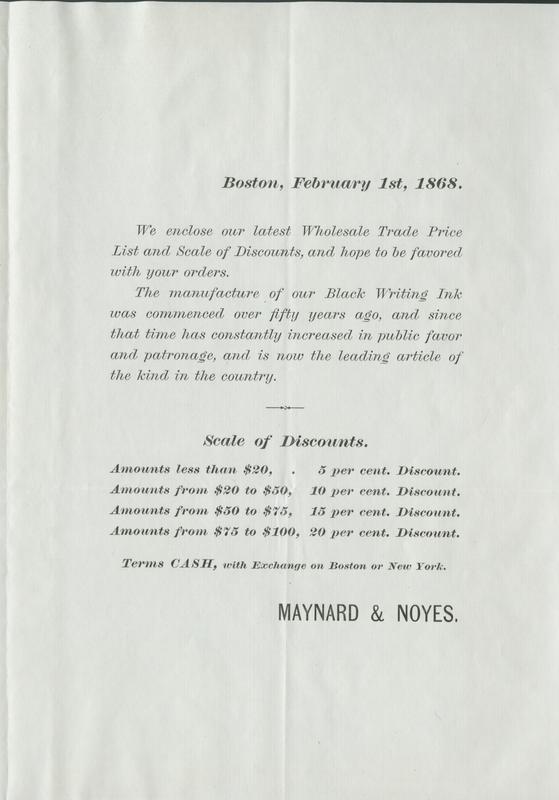 Maynard & Noyes, wholesale dealers in drugs, manufacturers of black writing ink, writing fluid, carmine ink, red, blue and stencil inks, ink powder, &c.