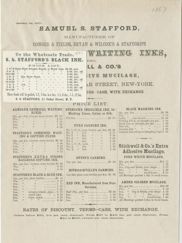 Samuel S. Stafford, manufacturer of Conger & Fields, Bryan & Wilcox's & Stafford's first class writing inks, also Stickwell & Co,'s extra adhesive mucilage, warehouse, 11 Cedar Street, New-York.