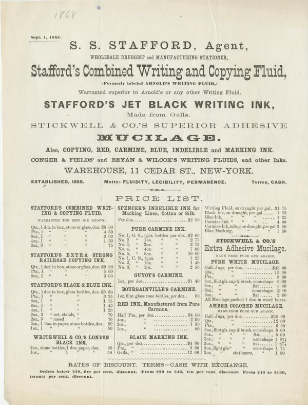 S. S. Stafford, agent, wholesale druggist and manufacturing stationer, Stafford's combined writing and copying fluid, (formerly labeled Arnold's writing fluid,) warranted superior to Arnold's or any other writing fluid.