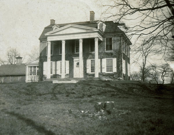Exterior view of front facade. Original portion (i.e. east end) of house constructed in 1801 for Philadelphia merchant Thomas Armat by builders Peter L. Berry and John Ardis. Armat had the house built for his only son, Thomas Wright Armat. The west end was built in 1810 and the Greek portico in 1830. Named after Loudoun County, Virginia where Armat first settled in America.