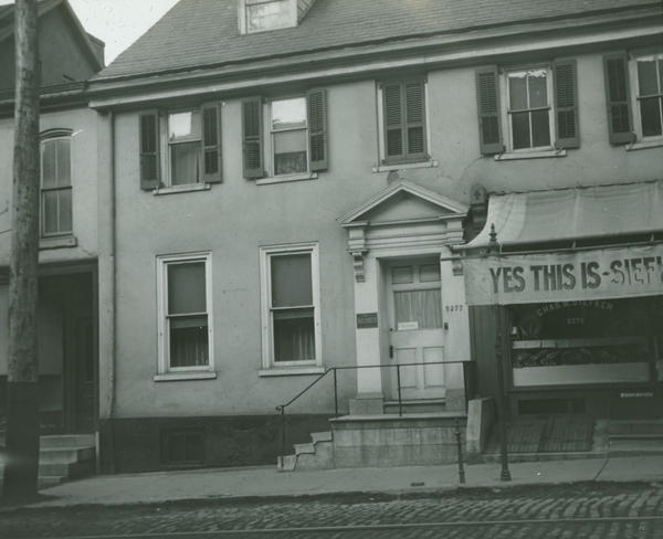 Exterior view of front facade of the Clarkson-Watson House, built circa 1745 for Matthew Clarkson, a merchant and mayor of Philadelphia from 1792 to 1796. Thomas Jefferson and Edmund Randolph stayed here during the yellow fever epidemic of 1793. The Bank of Germantown occupied the property from 1825 to 1869. John Fanning Watson, author of Annals of Philadelphia, also lived here. Includes a partial view of the neighboring business at 5275 Main Street (i.e. Germantown Avenue) owned by Chas. M. Stefken.