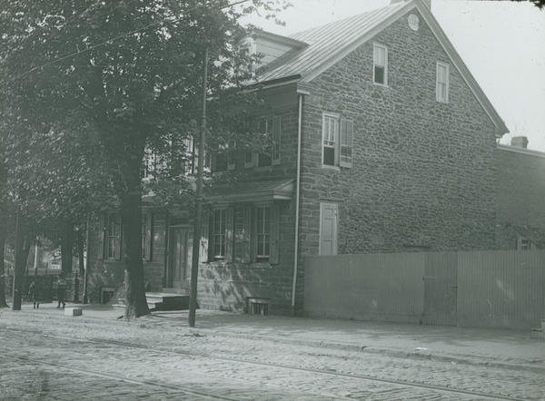 Exterior view of east front of house looking south. Built in 1758 by Benjamin Engle. The Engle family operated a tannery in the rear of the property along Honey Run. Demolished in 1955.