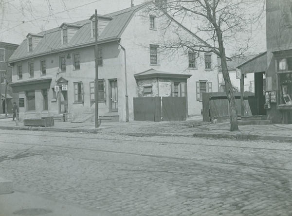 Exterior view of west front and south flank of tavern known as Washington Tavern since 1793. Also used as a market house in the 19th century. Includes a partial view of the entrance and storefront of the store located south of the tavern on Germantown Avenue.