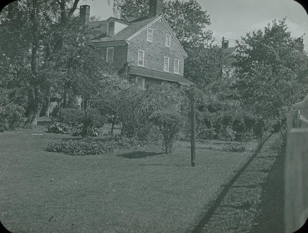 Exterior view of north flank of the former residence of John Johnson built 1765-1768 by master builder Jacob Knor at 6306 Germantown Avenue, Philadelphia, PA. Shows the house taken from the rear of the property looking toward Germantown Avenue. The three-story stone house has dormer windows and chimneys on the roof. In the foreground is the lawn and trees, which partially obscure the house. John Johnson resided in the house during the Battle of Germantown. The dwelling sustained damage including a hole in the parlor door caused by a cannon ball and a chipped corner. It served as a station on the Underground Railroad. The Johnson family owned the house until 1908. The Woman's Club of Germantown purchased the house in 1917, and in 1980, gifted the house and its contents to the Germantown Mennonite Historic Trust to operate as a house museum. In 2002, the deed of ownership was transferred to the Johnson House Historic Site, Inc.
