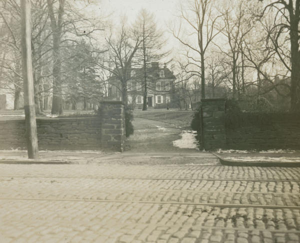 Exterior view of the colonial residence built 1763-1767 by master carpenter Jacob Knor for Philadelphia attorney Benjamin Chew at 6401 Germantown Avenue. In the foreground, shows Germantown Avenue, the sidewalk with an utility pole, and the stone wall surrounding the property. A long walkway leads to the house. Numerous trees grow on the grounds. Chew House, also known as Cliveden, was the site of the turning point in the Battle of Germantown in 1777. The Chew family enslaved people of African descent in the city of Philadelphia and in Germantown during the 18th and 19th centuries. The estate was the Chew family residence until 1972 when it was acquired by the National Trust for Historic Preservation.