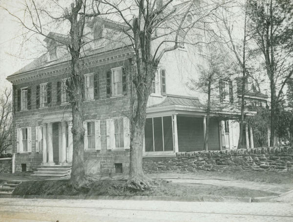 Exterior view of south flank and west front of dwelling built in 1792 by Joseph Miller. His daughter married James Gowen and the house descended through several generations of Gowens, including their son Franklin B. Gowen, Franklin E. Gowen and then his brother James E. Gowen. Later acquired by the Lutheran Theological Seminary.