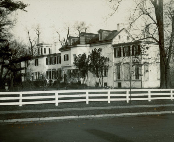 Exterior view of the north front of the Carlton Mansion, taken from the west. Purportedly named after an English castle inhabited by Queen Elizabeth I. The original house was destroyed by the British in 1777 but rebuilt in 1780 by Isaac Tustin. Served as Washington's Headquarters for a few weeks before and after the Battle of Brandywine. Purchased by Cornelius S. Smith in May of 1840 and later bequeathed to his children.