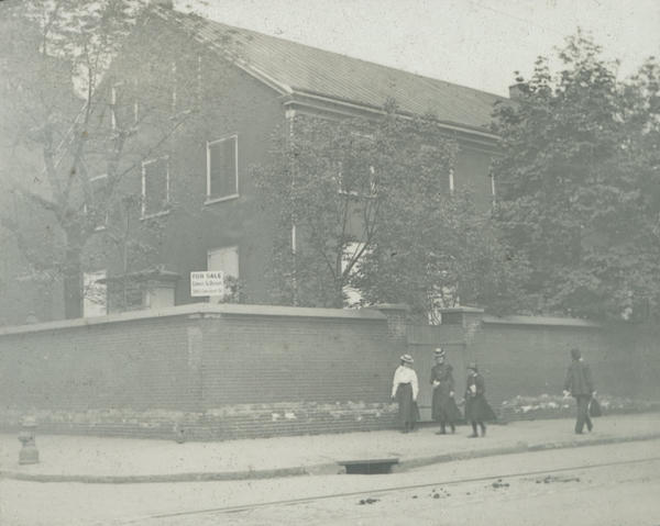 Depicts a large, red brick meeting house sitting behind a red brick wall at the northeast corner of 9th and Spruce Streets. A "for sale" sign is posted above the street signs on the brick wall. Two teenage girls in hats, shirtwaists and skirts walk along with a younger (or shorter) girl in similar dress. A man in a bowler, carrying a valise, has passed them.
