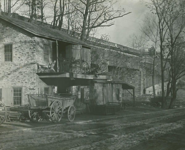 Exterior view of an old stone, two story blacksmith shop, across the street from Millverton and near the Robeson house and mill. A man works with a carriage frame on the second story, above the entrance and another man sits at the edge of the flat, overhanging roof nearby. Carriage frames and wheels are visible, along with the wall of the Norristown Railroad Bridge in the background.