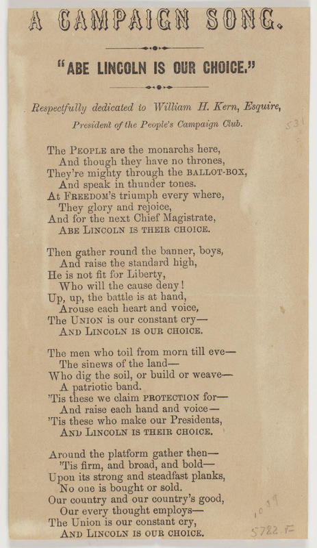 The People are the monarchs here (4 vs.) Headed: "A Campaign Song"; dedicated to William H. Kern, Esquire, President of the People's Campaign Club. 17.3 x 9.9 cm.