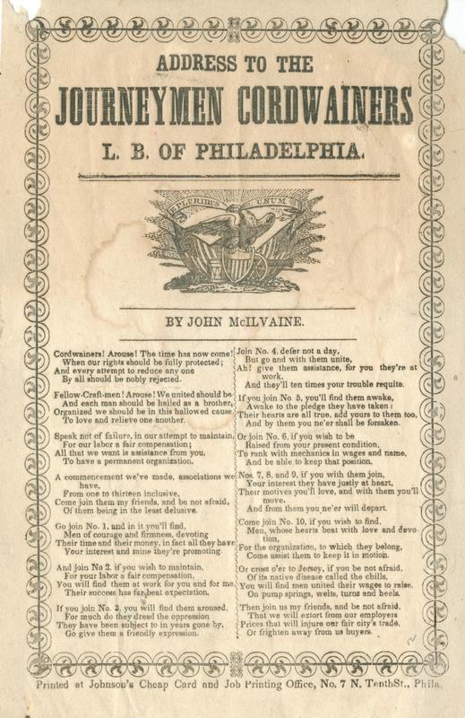 Cordwainers! Arouse! The time has now come (14 vs.) By John Mcllvaine; print. Johnson (2). T. o. border; eagle with shield and flags. 22.5 x 14.3