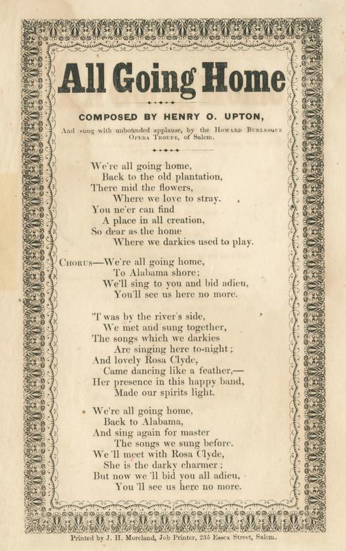 We're all going home (3 vs. and chor.) Composed by Henry O. Upton, And sung with un- bounded applause, by the Howard Burlesque Opera Troupe, of Salem; print. J. H. Moreland. T. o. border. 23.5 x 16.4 cm.