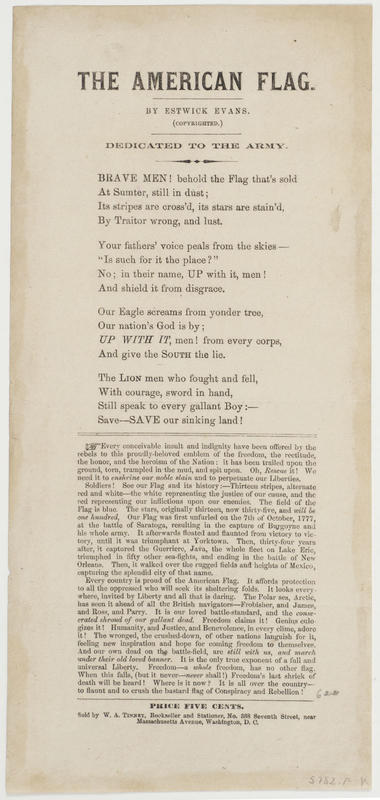 Brave Men! behold the Flag that's sold (4 vs.) By Estwick Evans; copyrighted; dedicated to the Army; with prose essay on the Flag below text; sold by W. A. Tinney. 27.5 x 12.7 cm.