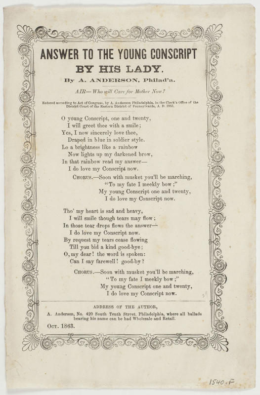 O young Conscript, one and twenty (2 vs. and chors.) Air—Who will Care for Mother Now? By A. Anderson, Philad'a, Oct. 1863; cop: A. Ander- son, EDPa., 1863; [for sale] A. Anderson. A-J border. 23.5 x 15.3 cm.