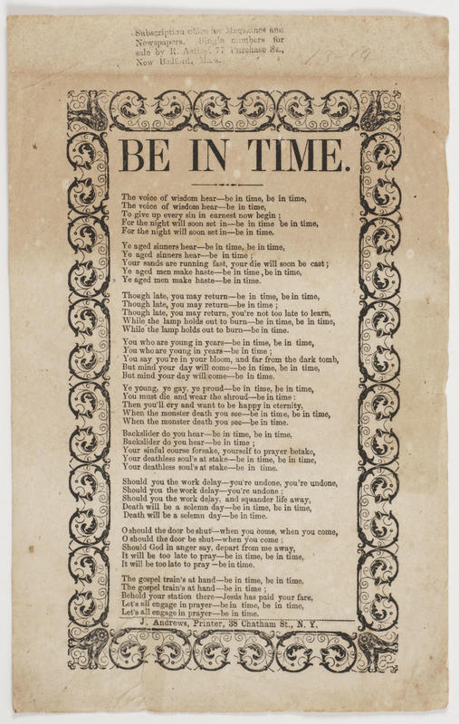 The voice of wisdom hear - be in time, be in time (9 vs.) Print. Andrews; with Astley's imprint added. T. o. border. 24.5 x 15.3 cm.