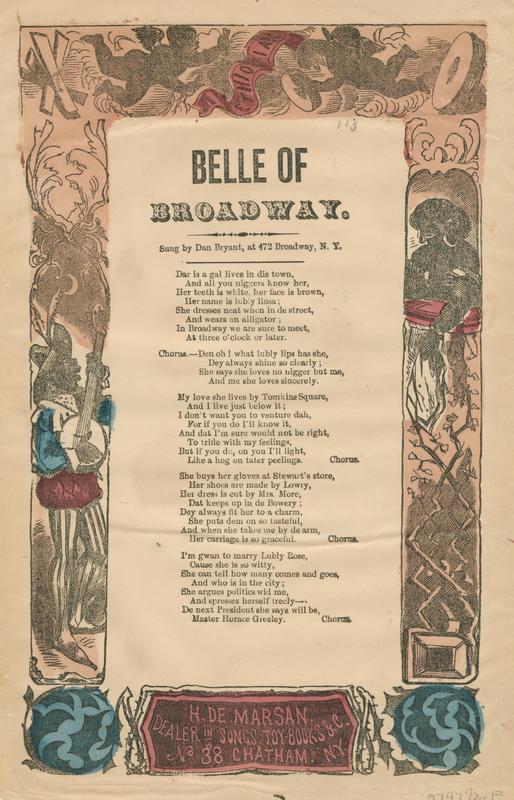 Dar is a gal lives in dis town (4 vs. and chor.) Sung by Dan Bryant, at 472 Broadway, N.Y.; [publ.] De Marsan (1). De Marsan Ethiopian border, col. 24.6 x 16 cm.
