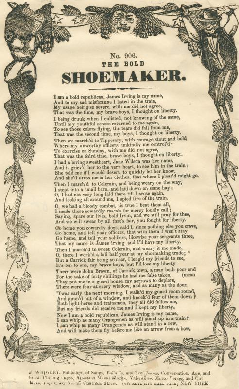 / am a bold republican, James Irving is my name (11 vs.) Sheet no. 906; publ. Wrigley (1). Wrigley horned imp border. 24.6 x 15.6 cm.