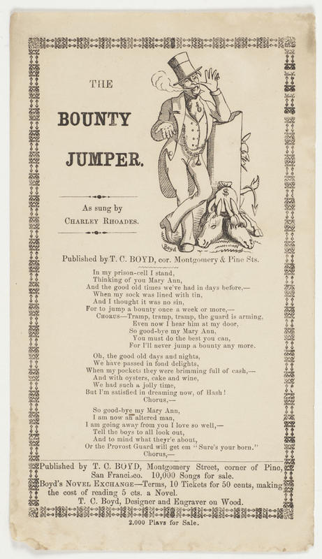 In my prison-cell I stand (3 vs. and chor.) As sung by Charley Rhoades; publ. Boyd; advs: Boyd's Novel Exchange, and 2,000 Plays for Sale. T. o. border; bounty jumper with symbols of his trade. 20.9 x 12 cm.