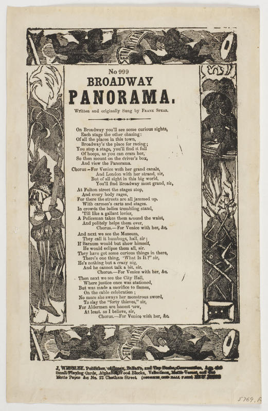 On Broadway you'll see some curious sights (4 vs. and chor.) Written and originally Sung by Frank Spear; sheet no. 999; publ. Wrigley (1). Wrigley Ethiopian border. 24.5 x 15.6 cm.