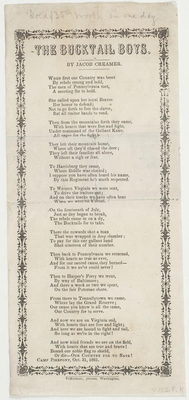 When first our Country was beset (12 vs.) By Jacob Creamer, Camp Pierpont, Oct. 31, 1861; print. Polkinhorn. T. o. border. 26.4 x 11.9 cm.