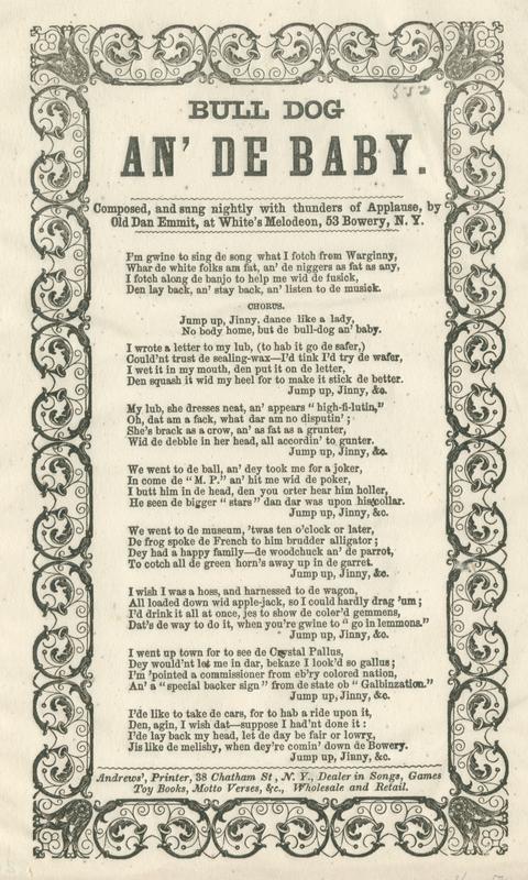 I'm gwine to sing de song what I fotch from Warginny (8 vs. and chor.) Composed, and sung nightly with thunders of Applause by Old Dan Emmit, at White's Melodeon, 53 Bowery, N.Y.; print. Andrews. T. o. border. 23.2 x 15.1 cm.