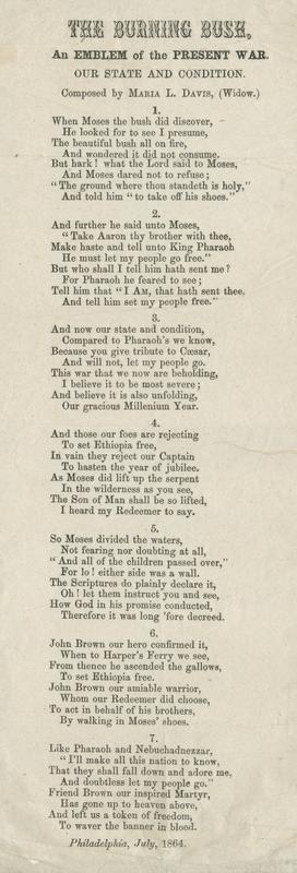 When Moses the bush did discover (7 vs.) Composed by Maria L. Davis, (Widow.) Philadelphia, July, 1864. 29 x 12 cm.