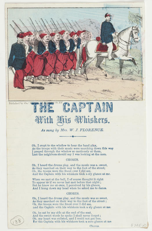 Oh, I crept to the window to hear the band play (3 vs. and 2 chors.) As sung by Mrs. W. J. Florence. Letter paper; blue ink; hdpc. Magnus 138, col.; publ. Magnus (1). 20.4 x 12.6 cm.