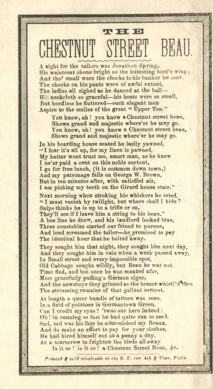 A sight for the tailors was Jonathan Spring (5 vs. and chor.) Printed and sold at the S.E. cor. 4th and Vine, Phila. [George S. Harris] Multi-line border. 20.6 x 10.6 cm.