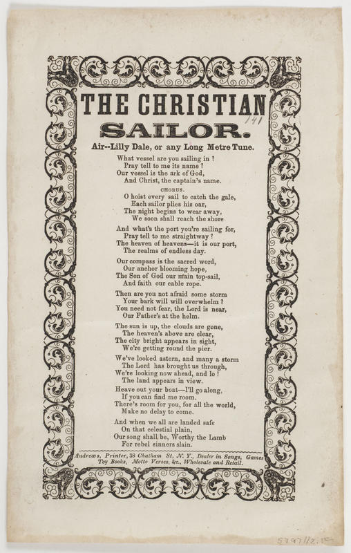 What vessel are you sailing in (8 vs. and chor.) Air—Lilly Dale, or any Long Metre Tune. Print. Andrews. T. o. border. 24.8 x 15.6 cm.