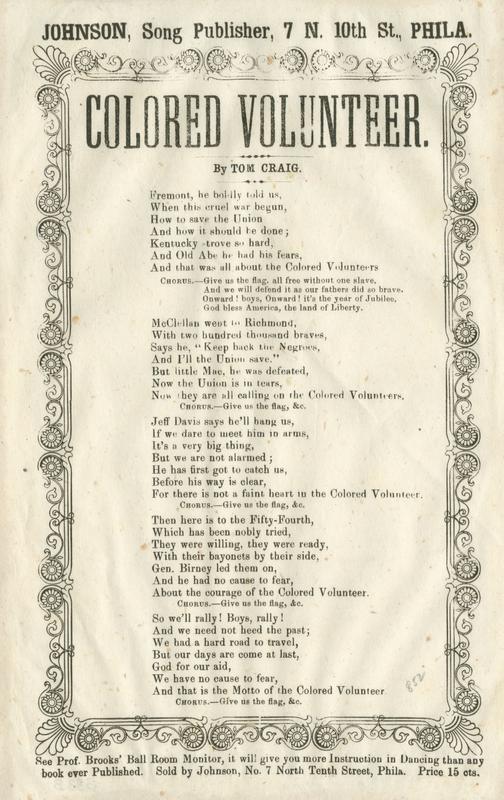 c. Title: "A Song, dedicated to The Colored Volunteer"; [without author's name;] publ. by the Supervisory Committee for Recruiting