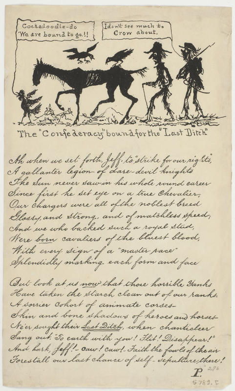 Ah when we set forth, Jeff, to strike for our rights (2 vs.) [Signed] P. Letter paper; text in script; cartoon of rooster, horse, two crows and two Confederates. 23.5 x 14 cm.