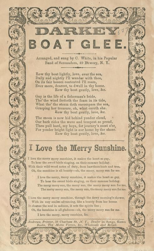 Row thy boat lightly, love, over the sea (3 vs.) Arranged, and sung by C. White, in his Popular Band of Serenaders, 49 Bowery, N.Y.; 2nd song: "I Love the Merry Sunshine"; print. Andrews. T. o. border. 23.5 x 15 cm.