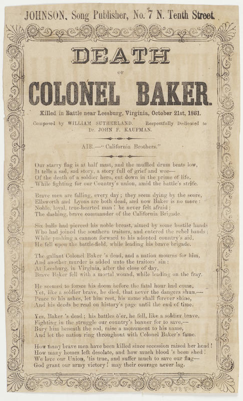 DEATH OF COLONEL BAKER. KILLED IN BATTLE NEAR LEESBURG, VIRGINIA, OCTOBER 21ST, 1861.