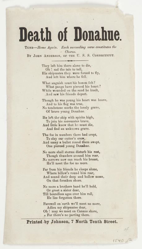 They left him there alone to die (9 vs., "each succeeding verse constitutes the Chorus".) Tune—Home Again. By John Anderson, of the U.S.S. Connecticut; print. Johnson (2). 21.4 x n.8 cm.