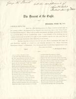 a. Philadelphia, October 7th, 1865; with letter beginning: Samuel B. Fales, Esq. Dear Sir: - The following poem on the Eagle, recited by me last night. . . was suggested by my delightful visit. . . to the 'Union Volunteer Refreshment Saloon'. . . [signed] T. Buchanan Read." 27.8 x 21.3 cm.