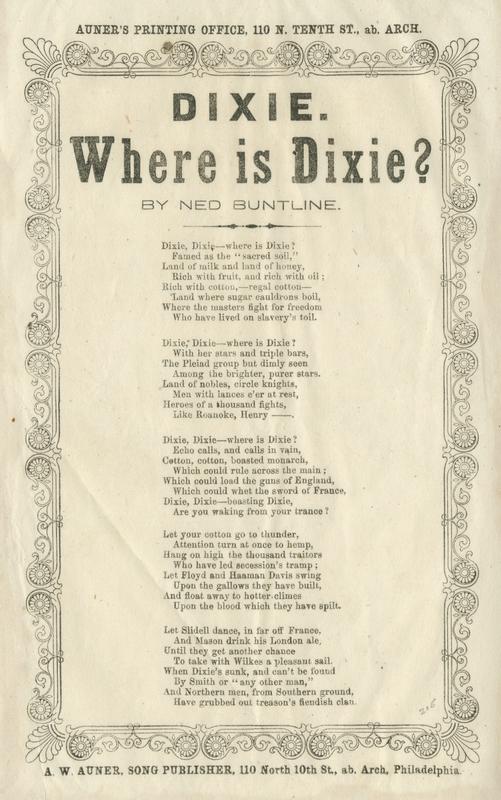Dixie, Dixie - where is Dixie (5 vs.) By Ned Buntline [Edward Zane Carroll Judson]; publ. Auner (3). A-J border. 23.3 x 14.5 cm.
