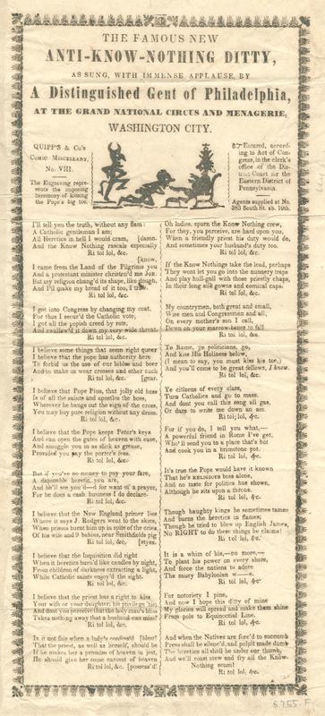I'll tell you the truth, without any flam (22 vs.) As sung, with immense applause, by A Distinguished Gent of Philadelphia, at the Grand National Circus and Menagerie, Washington City; advs: Quipp's and Co's Comic Miscellany. No. VIII, and Agents supplied at No. 383 South St. ab. 10th; cop: EDPa. T.o. border; comic cut of the ceremony of kissing the Pope's toe. 36.4 x 17.5 cm.