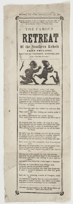 -Aandom* the "Cotton Heroes" a tale I will relate (9 vs.) Tune—"The Bold Privateer." Headed: "Quipps and Co's Comic Miscellany-No XXII"; written by Professor Shortfellow; cop: 1847, Quipps and Co., EDPa; adv: Newsmen and boys supplied at No. 1021 Market Stree